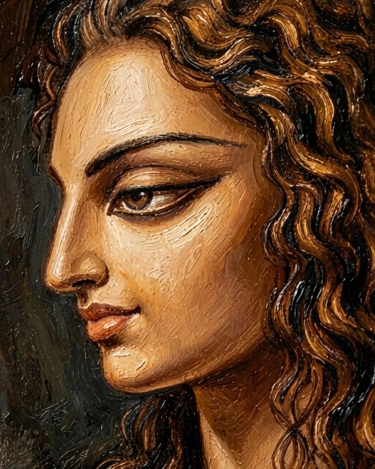 The masterful use of earthy tones, bold brushstrokes, and striking chiaroscuro against a textured canvas highlights her inner turmoil while maintaining her unwavering dignity. The sharp contours of her profile and the dynamic, cascading flow of her hair symbolize her resilient spirit navigating a labyrinth of complex emotions. Through this intimate and deeply personal interpretation, the canvas transcends the epic narrative, offering a universal reflection on desire, duty, and the enduring ache of a love unfulfilled.