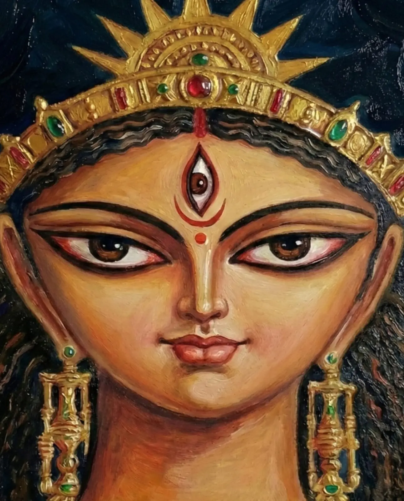 Devi Durga as Rajashri” presents the goddess in a regal and composed form, where serenity and authority exist in perfect balance. Her steady gaze and symmetrical features convey dignity, wisdom, and inner command, while the rich adornments suggest prosperity without excess. The dark, textured background enhances the luminous quality of the face, allowing the expression to remain calm, centered, and quietly powerful.