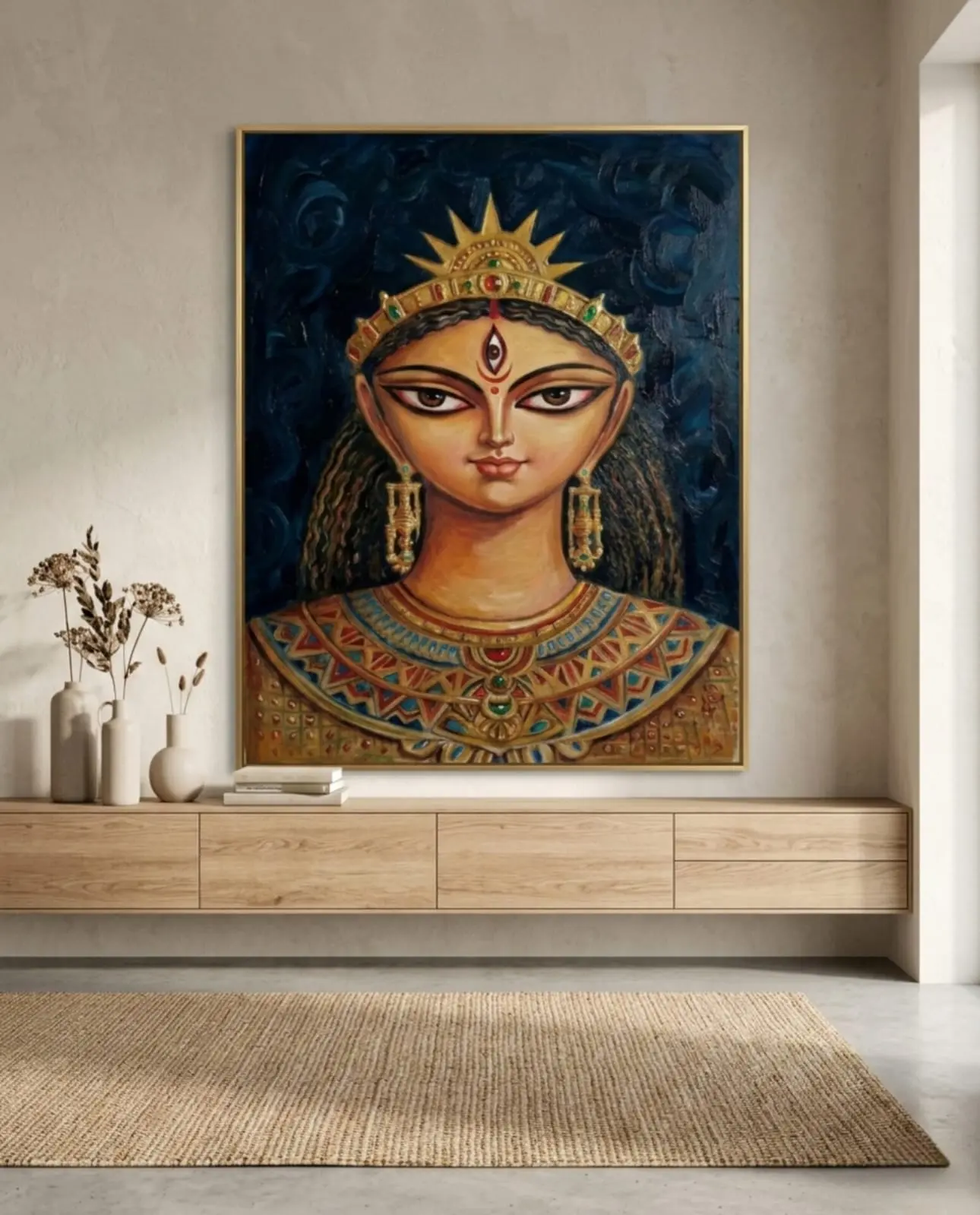 Created from an original hand-painted portrait, expressing royal grace, strength, and divine dignity.