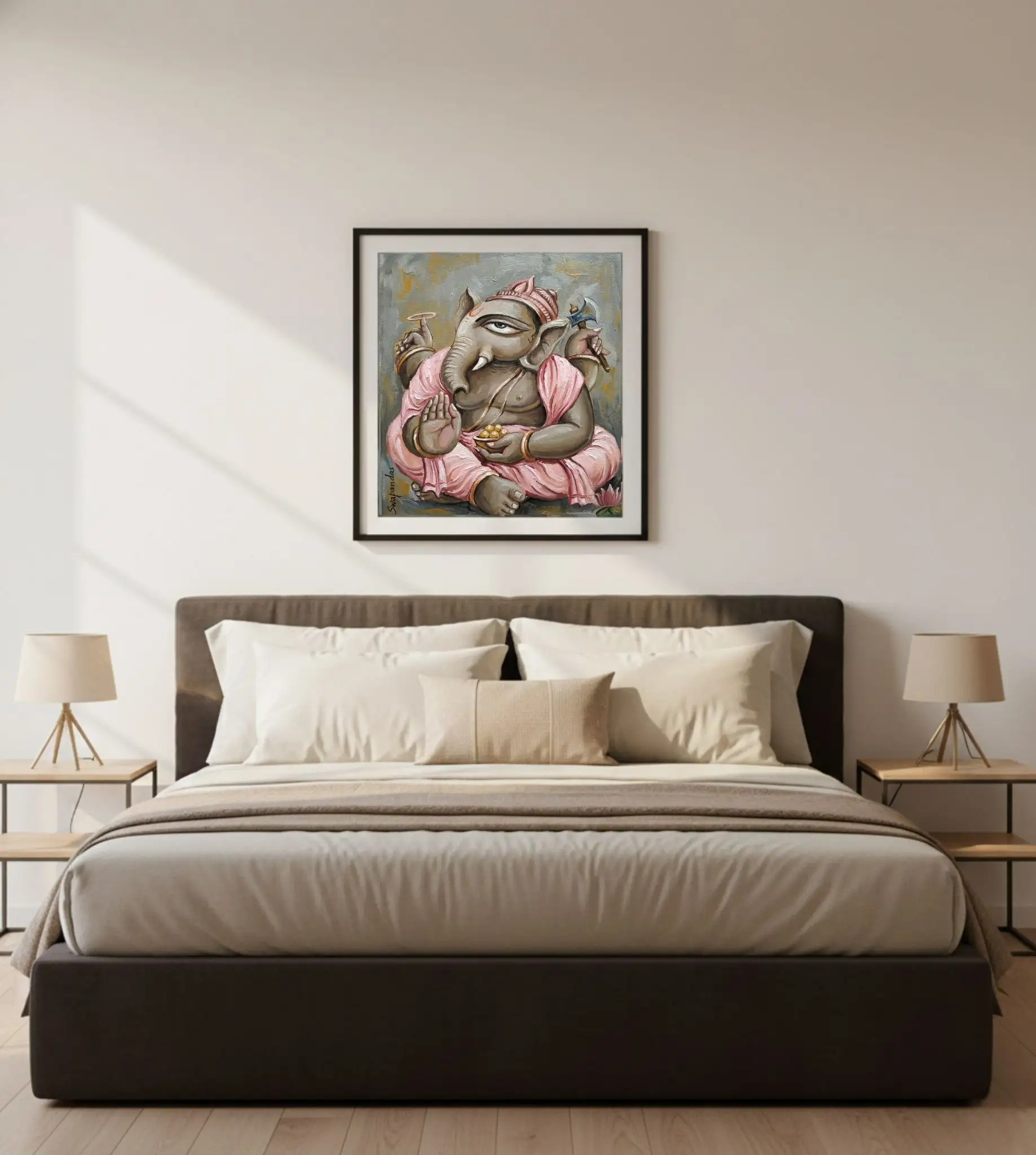 The composition reflects serenity and inner balance, allowing the artwork to blend harmoniously into living rooms, bedrooms, meditation areas, and personal prayer spaces. The subtle detailing and graceful form of Ganesha create a soothing visual experience that supports focus, mindfulness, and spiritual connection without overwhelming the space.