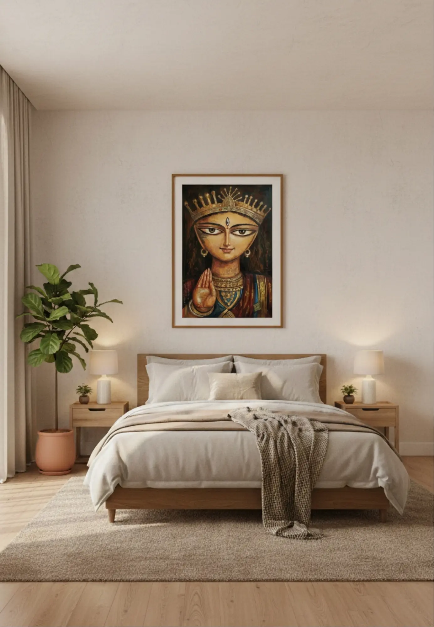 Rendered with rich tonal depth and expressive detailing, the artwork blends classical Indian aesthetics with a contemporary artistic sensibility. The calm yet commanding gaze, the symbolic gestures, and the intricate ornamentation together convey a sense of divine assurance and sacred balance. Every visual element is thoughtfully composed to evoke both devotion and quiet contemplation, making the piece spiritually uplifting while remaining visually sophisticated.