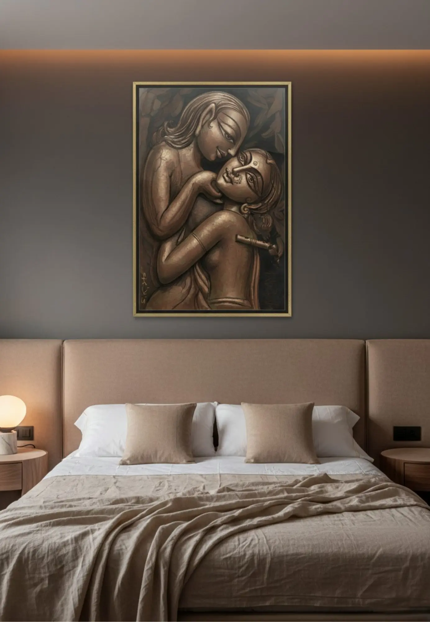Eternal Embrace is a soulful digital wall artwork by Swapan Kumar Das, portraying an intimate moment of love, trust, and quiet connection. Inspired by sculptural forms and timeless human emotions, this artwork captures the tenderness of two souls drawn together in a gentle, unspoken bond. The expressive faces, flowing lines, and earthy metallic tones create a sense of depth and emotional warmth that feels both classic and contemporary.