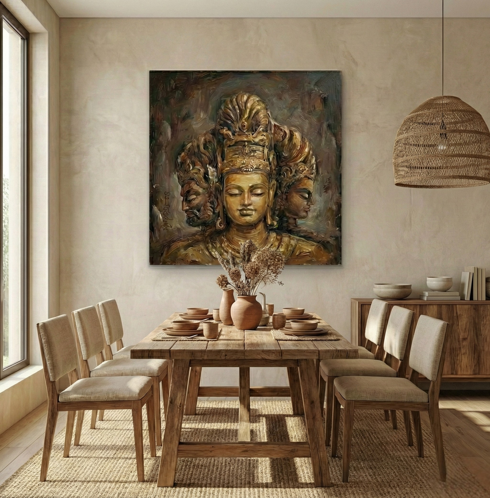 Ideal for living rooms, bedrooms, meditation spaces, studios, or prayer corners, Eternal Trinity functions as a powerful focal point while maintaining a peaceful and harmonious presence. Whether displayed individually or as part of a curated art collection, it adds spiritual depth and refined elegance to any space.