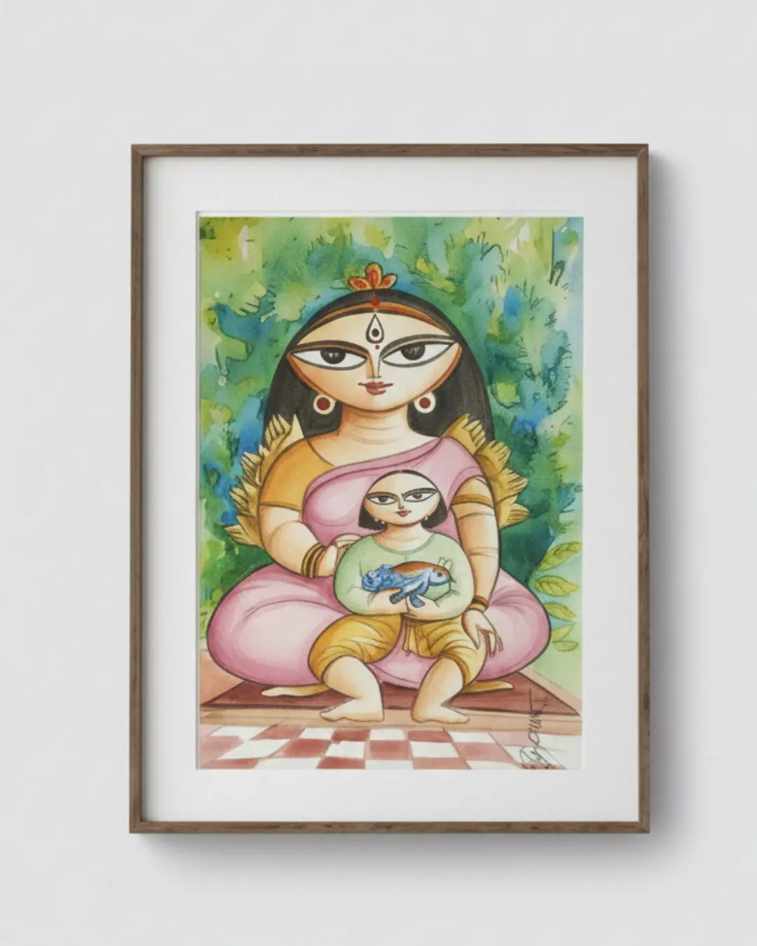 The presence of the child resting securely with Maa Durga symbolizes innocence, trust, and the eternal bond between mother and child. The surrounding natural elements and balanced color palette enhance the sense of peace, spiritual grounding, and emotional comfort. The artwork carries a quiet strength—one that reassures rather than overwhelms—making it deeply meditative and emotionally resonant.