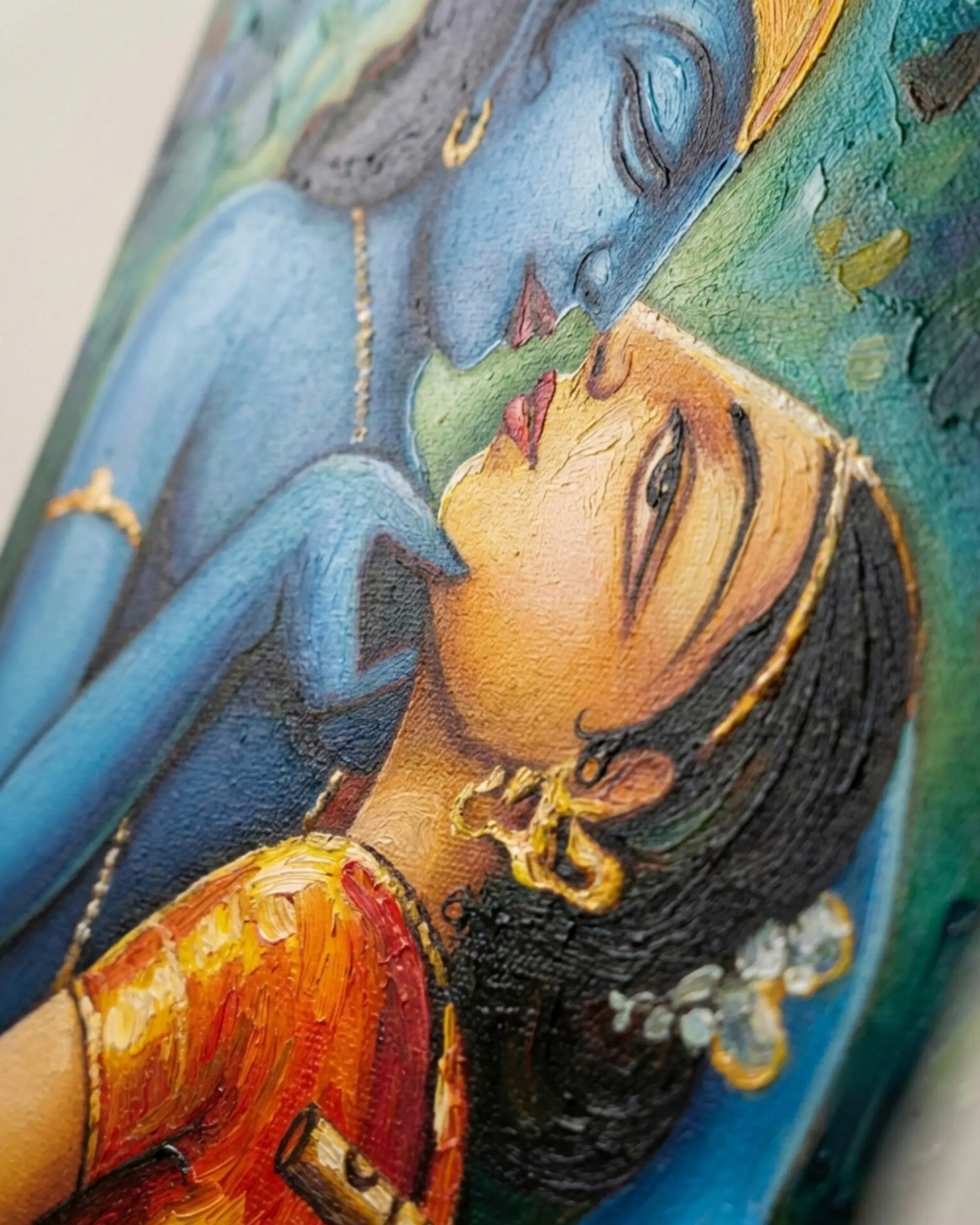 Created by Indian artist Swapan Kumar Das, this artwork reflects fine artistic craftsmanship and deep cultural inspiration. The intimate portrayal of Radha and Krishna makes it especially suitable for bedrooms, living rooms, meditation spaces, and spiritual corners, adding warmth, harmony, and emotional depth to your home décor. The artwork works equally well in modern, minimal, and traditional interiors.