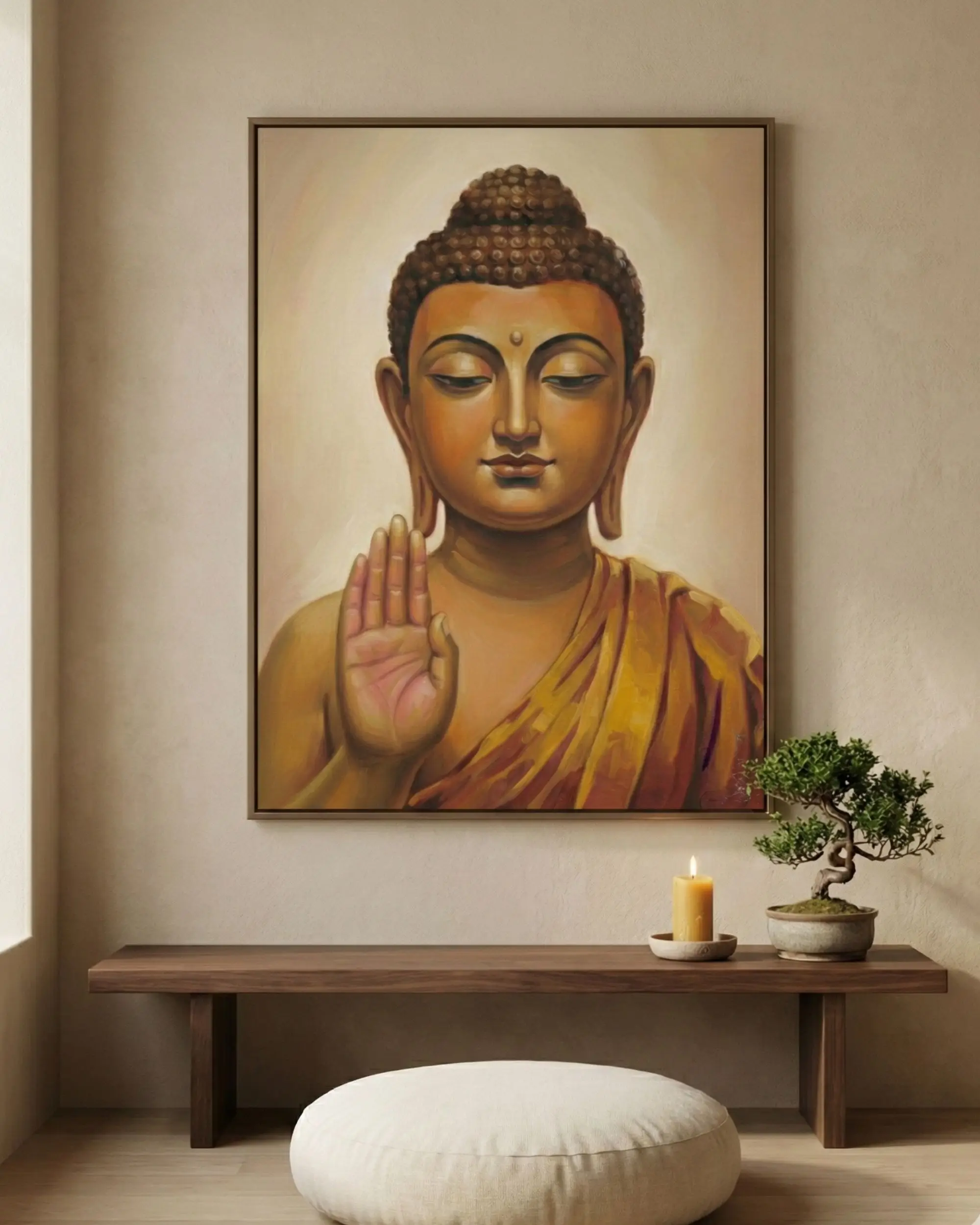Designed for meditation rooms, yoga studios, mindfulness spaces, and modern home décor, this digital artwork helps create an atmosphere of calm and positive energy. Its vertical composition works beautifully as a statement wall piece, whether displayed large or medium-sized, and complements neutral, minimalist, and spiritual interiors.