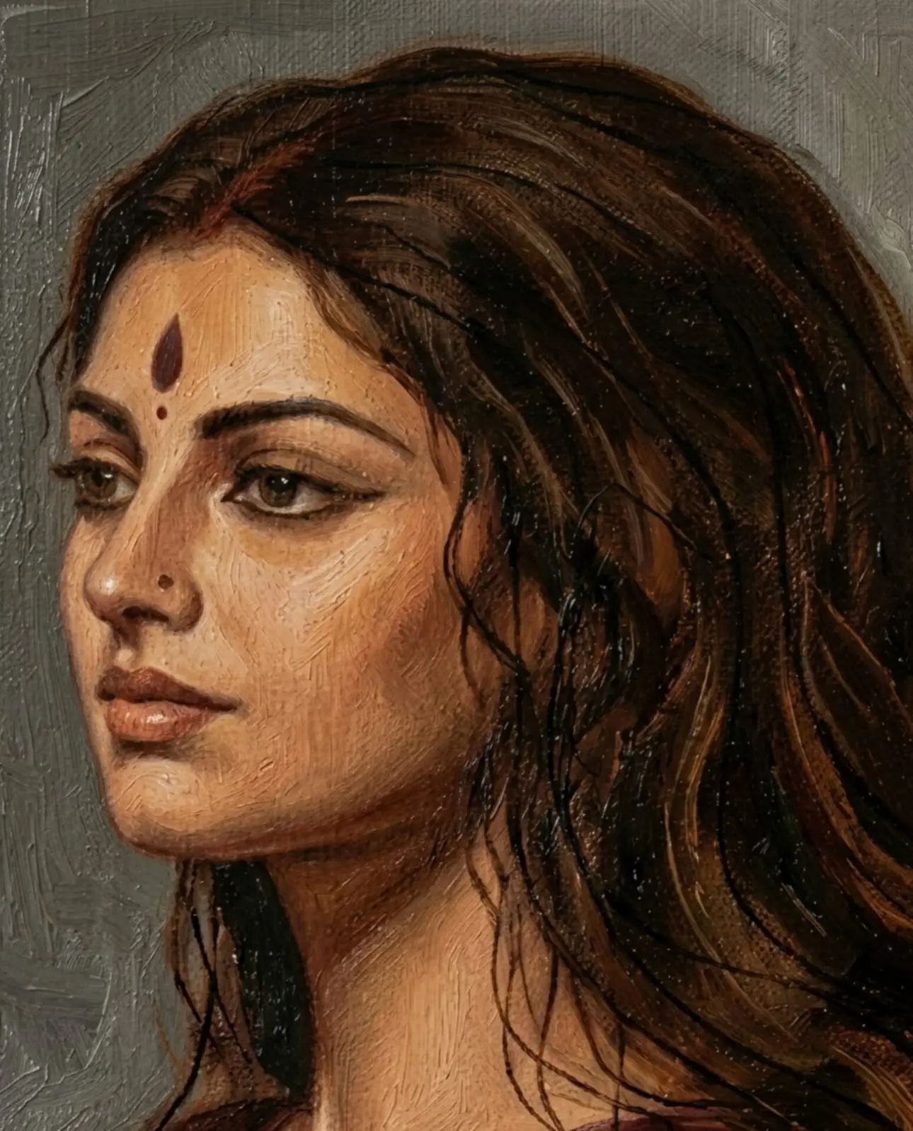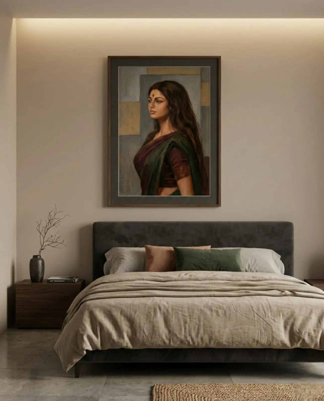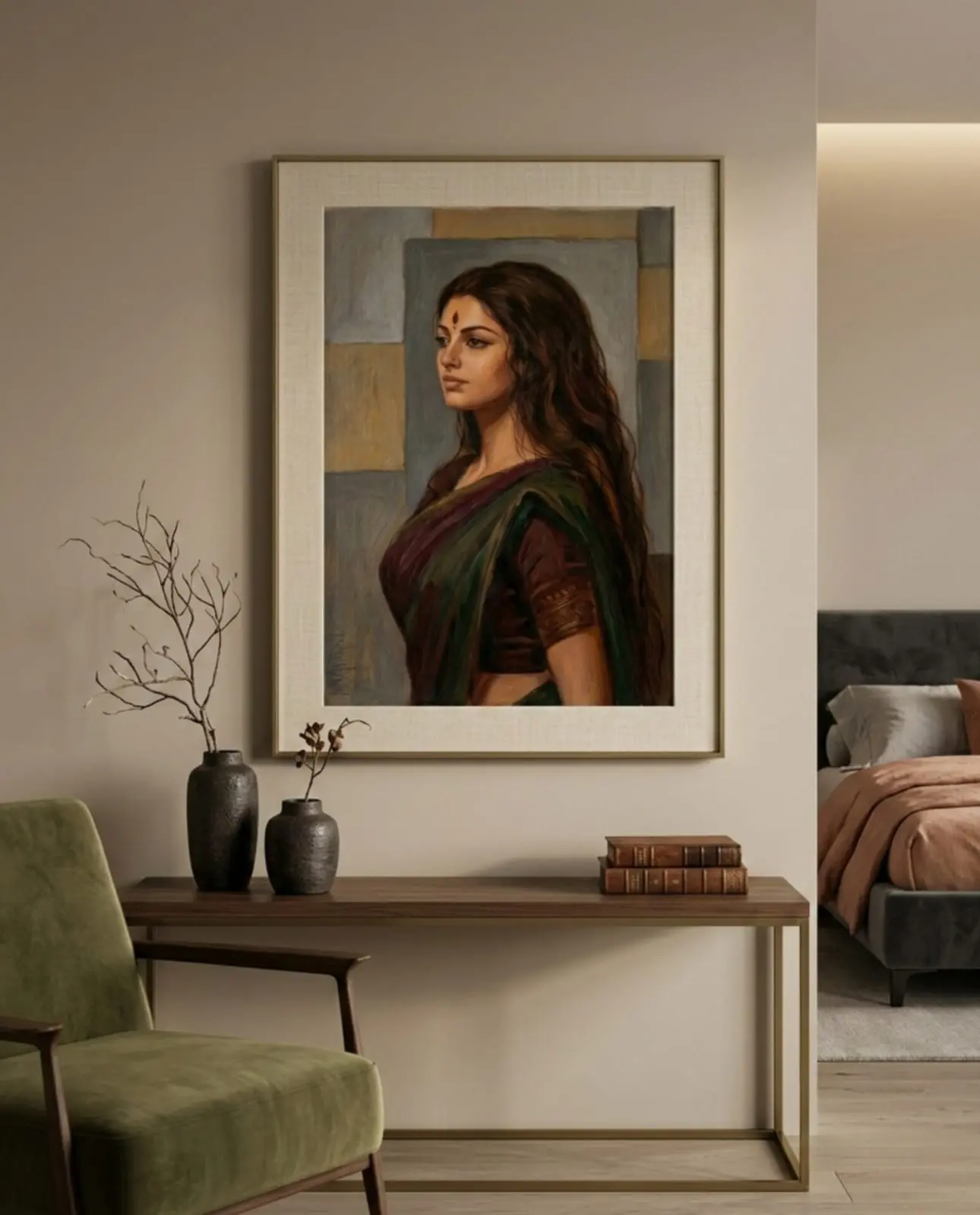The composition bridges classical Indian portrait sensibilities with a contemporary visual language. Muted grey and ochre geometric forms in the background create a structured, modern contrast to the organic softness of the figure. Earthy tones, textured brushwork, and a thoughtful play of light and shadow lend depth and realism, reinforcing the artist’s belief that texture carries emotional presence.