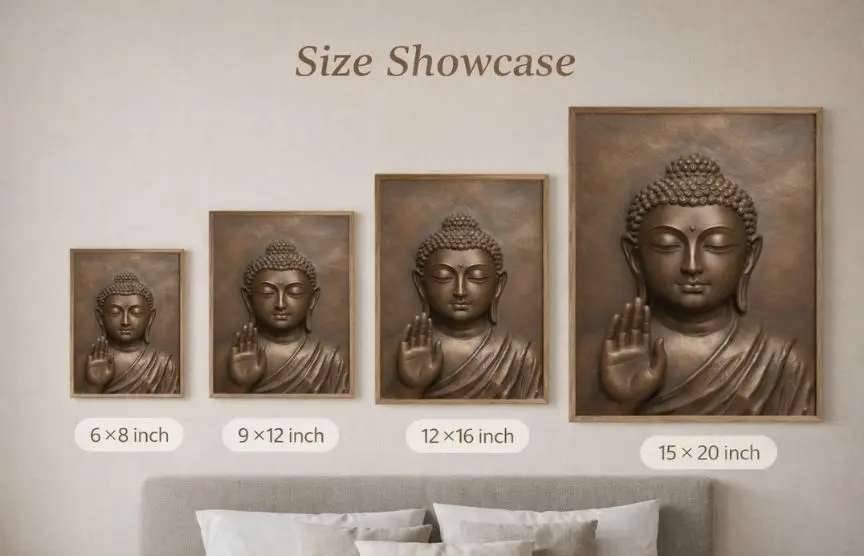 Originally envisioned as a sculptural relief, this artwork has been carefully preserved and enhanced in high resolution digital format, ensuring that every detail—from the gentle facial expression to the subtle bronze-like textures—remains rich, expressive, and visually immersive when printed. The result is a sophisticated digital artwork that brings a sense of harmony and mindfulness into your surroundings.